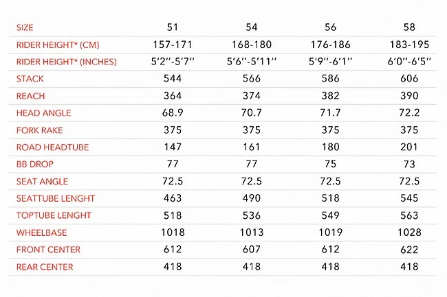 • Handlebars: (51: 40cm – 54&56: 42cm – 58: 44cm)
