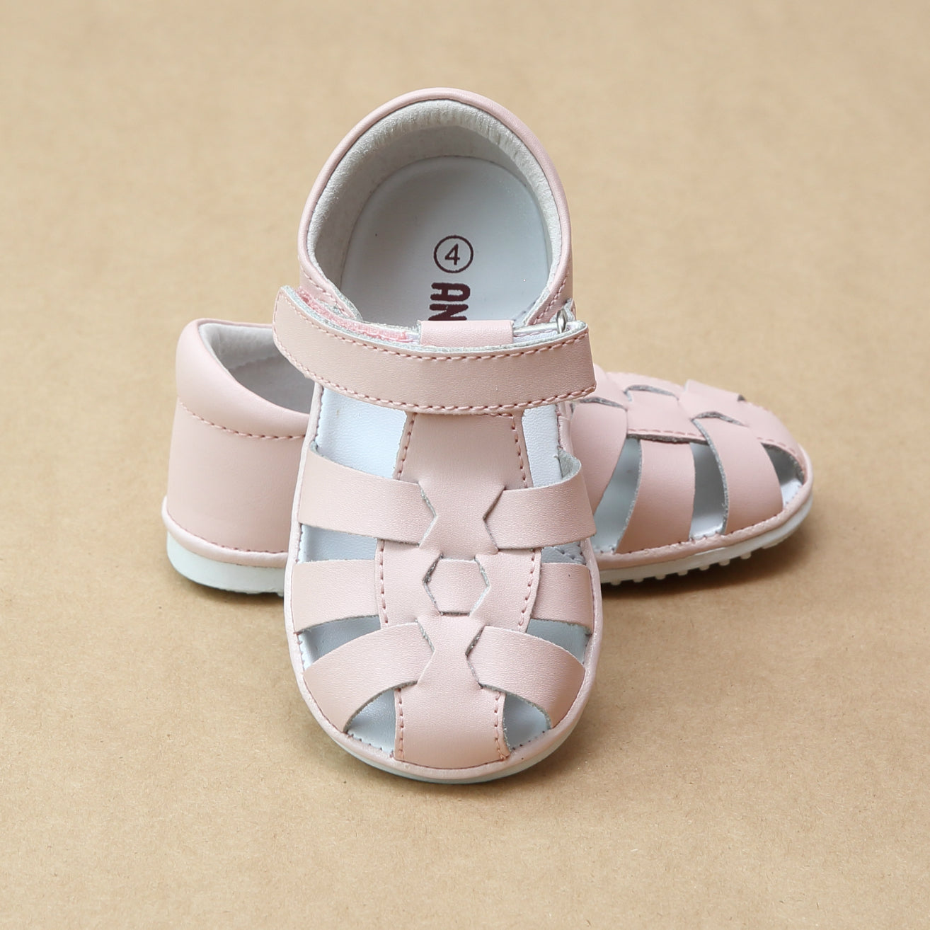 Lightweight leather fisherman sandal with rubber sole and hook-and-loop velcro ankle strap, perfect for early/first walkers. This is our favorite baby-friendly classic sandal for little girls, and we are in love with the baby pink color.