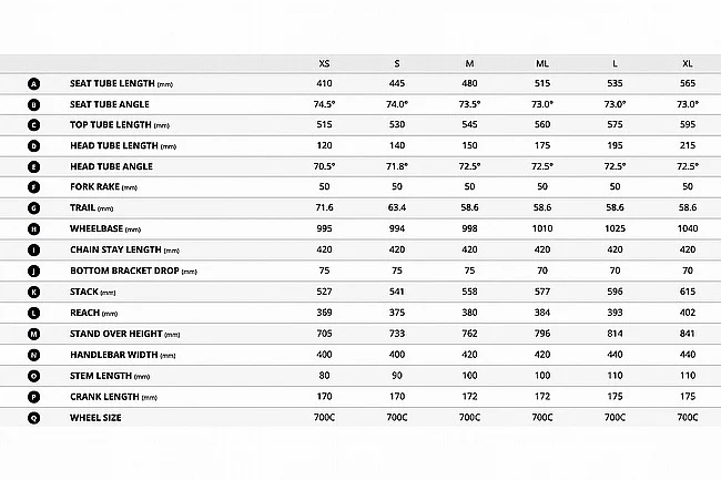 • Crankset: Shimano FC-RS520, 34/50 XS:170mm, S:170mm, M:172.5mm, M/L:172.5mm, L:175mm, XL:175mm
