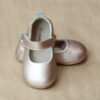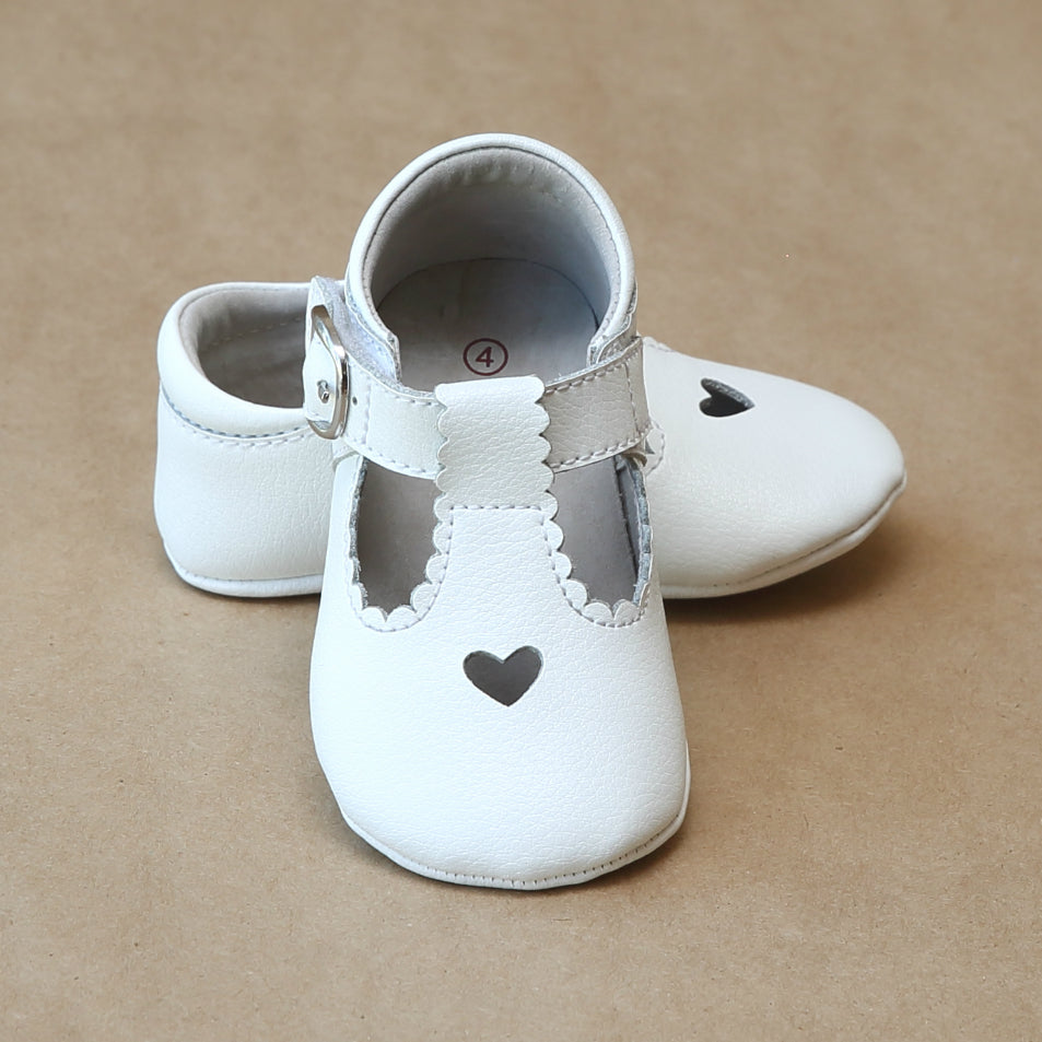 Irresistible heart perforated crib mary jane in soft grainy leather and non-skid rubber outsole. Velcro strap with buckle accent. Our shoe of choice for gifting.