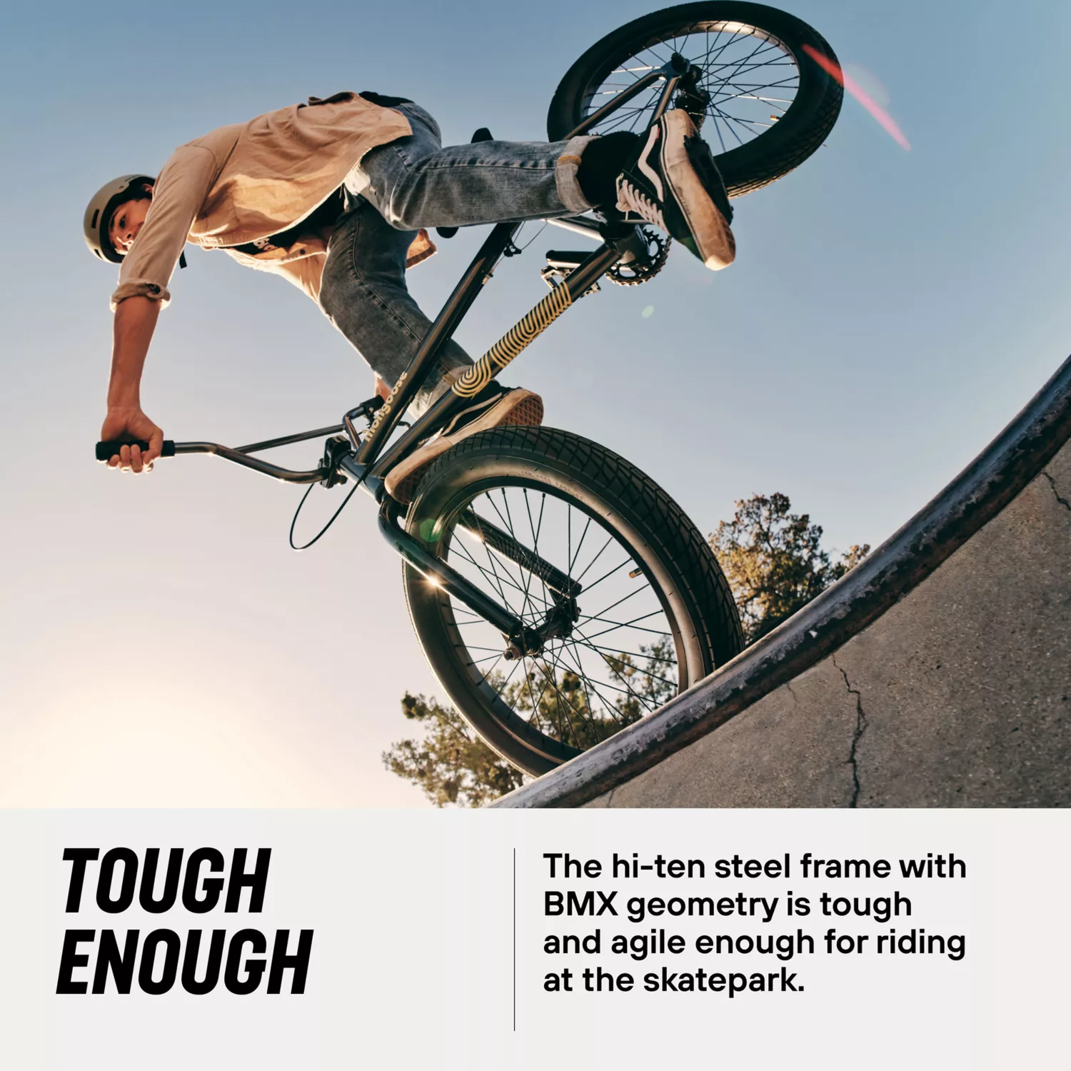 - Hi-Ten steel frame with BMX geometry is tough and agile enough for riding at the skatepark