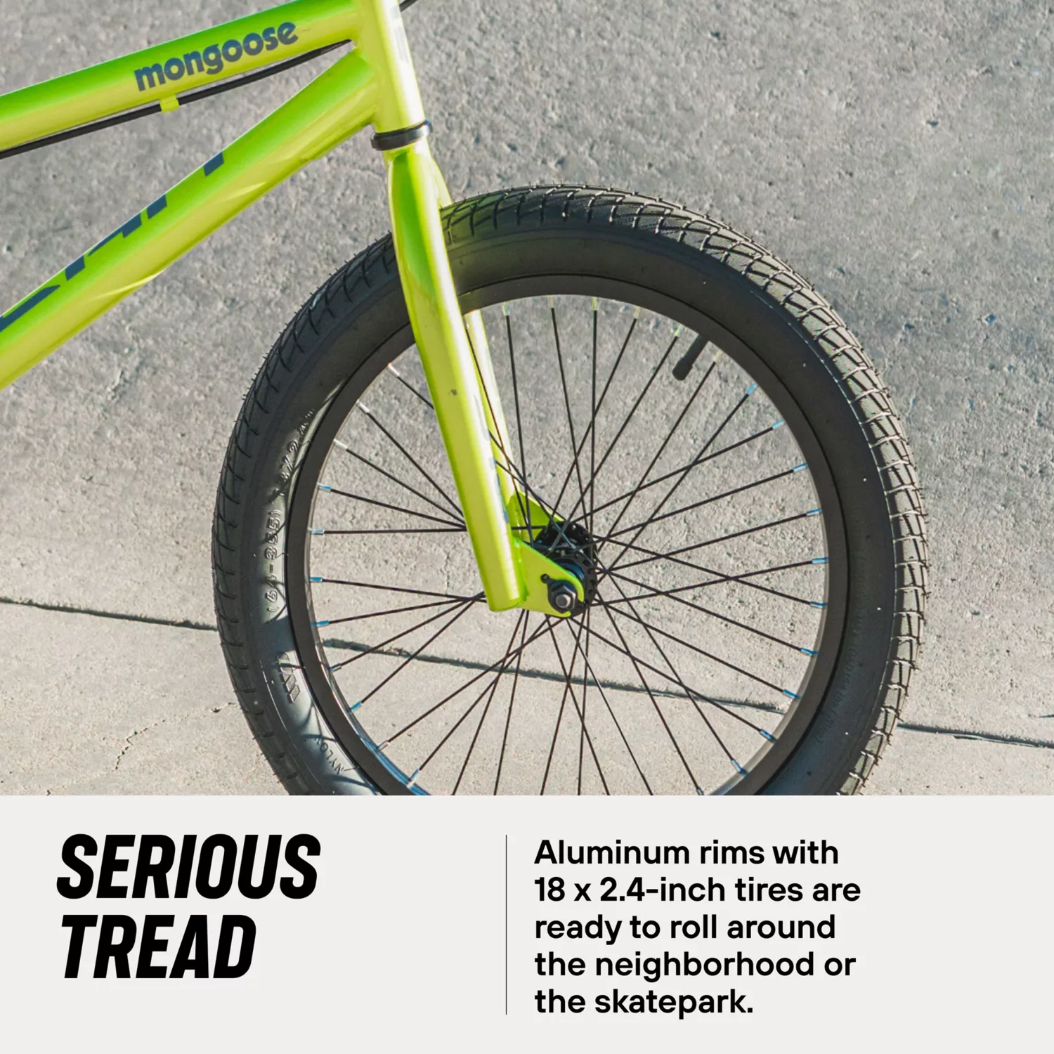 - Aluminum rims with 18 x 2.3-inch tires are ready to roll around the neighborhood or the skatepark